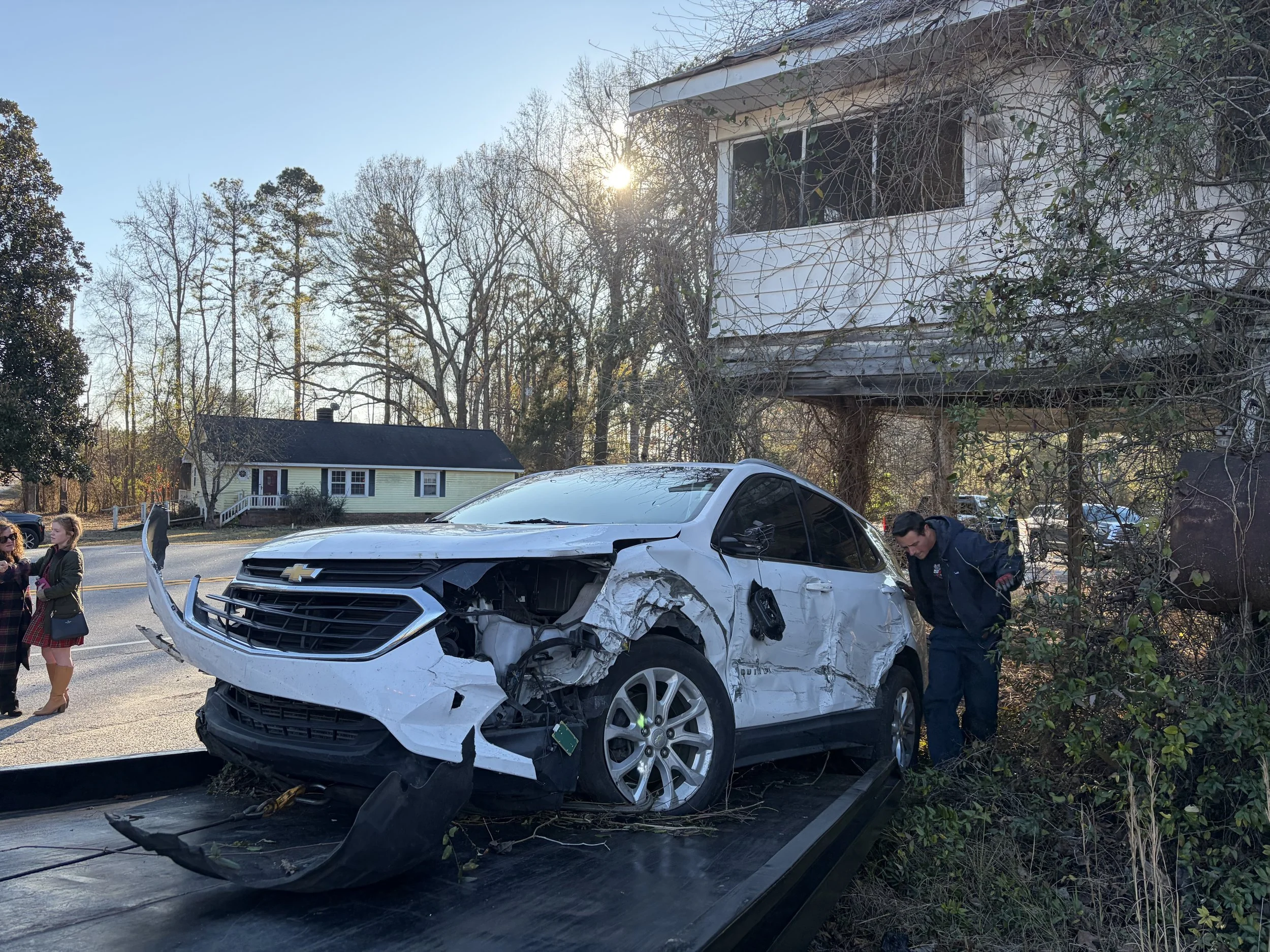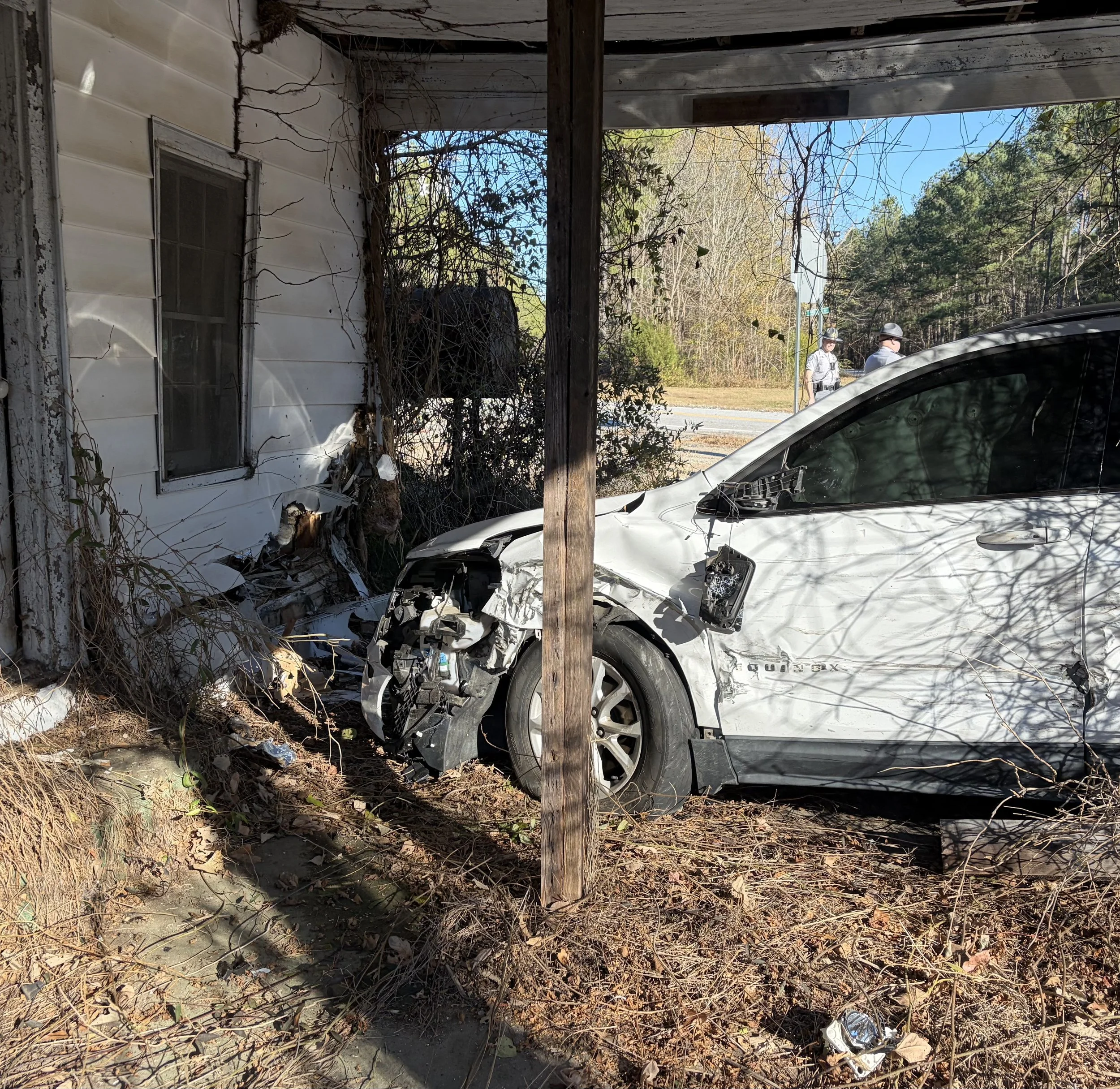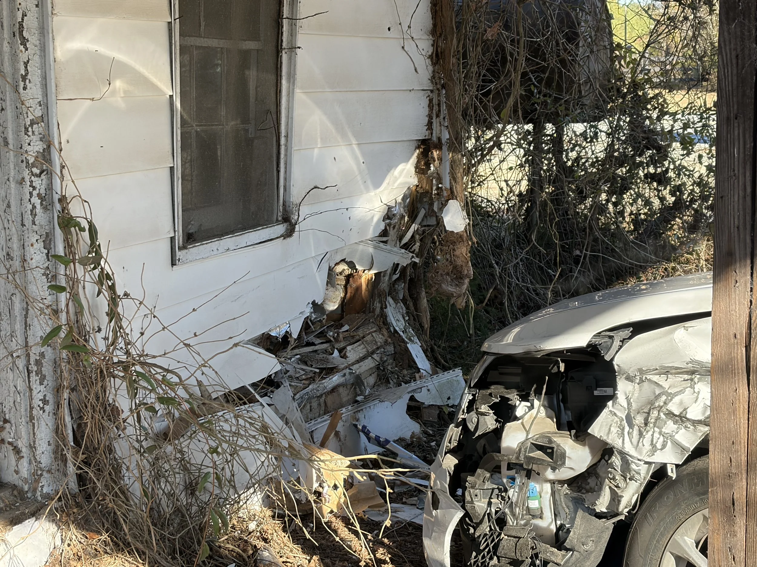 My right foot was stuck, and I could only pull up my left leg. Bringing my left leg from under my steering wheel and over the dash, rolling onto my stomach on top of the console, I kicked the passenger door with all my might and was able to finally free my right foot and crawl out of my car onto the ground underneath the country store. The first sight was the car that hit me and the horrific condition it was in. The driver was still in the car and there was no movement that I could see. Eventually, the driver’s door broke open, and the driver walked out with no injuries. A young, Hispanic man, unable to speak any English, made his way over to me and I flagged down the next vehicle that passed. His name was Mario and he, too, was scared.